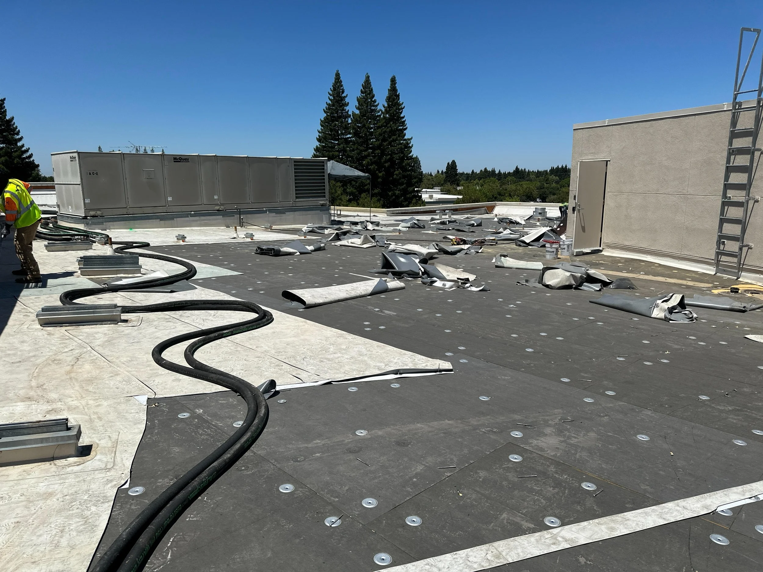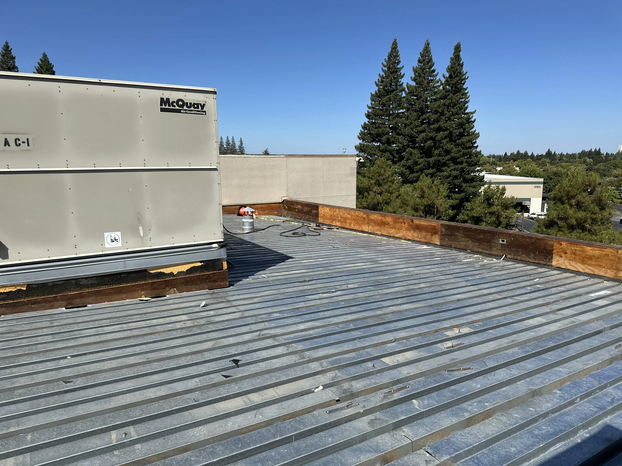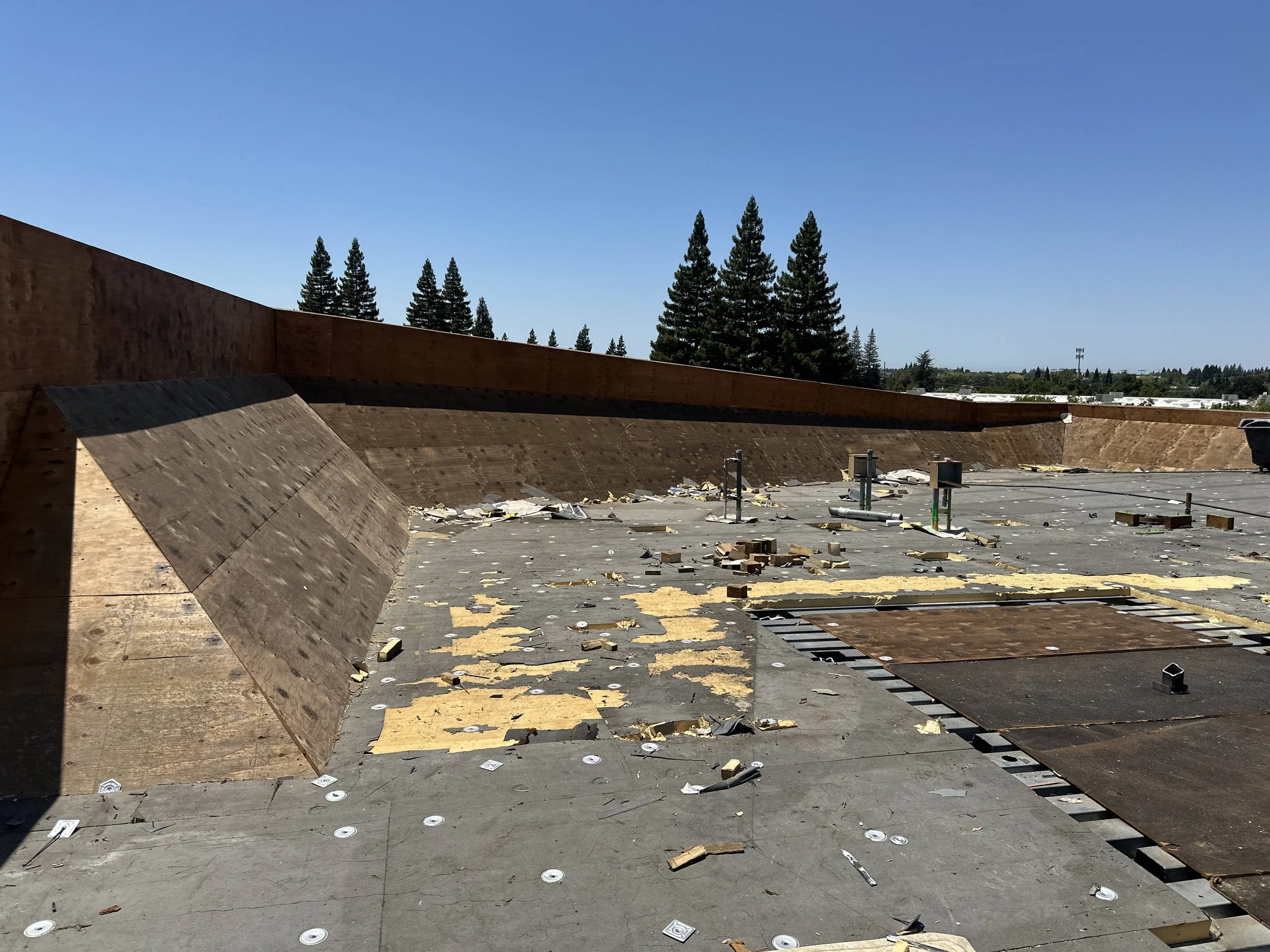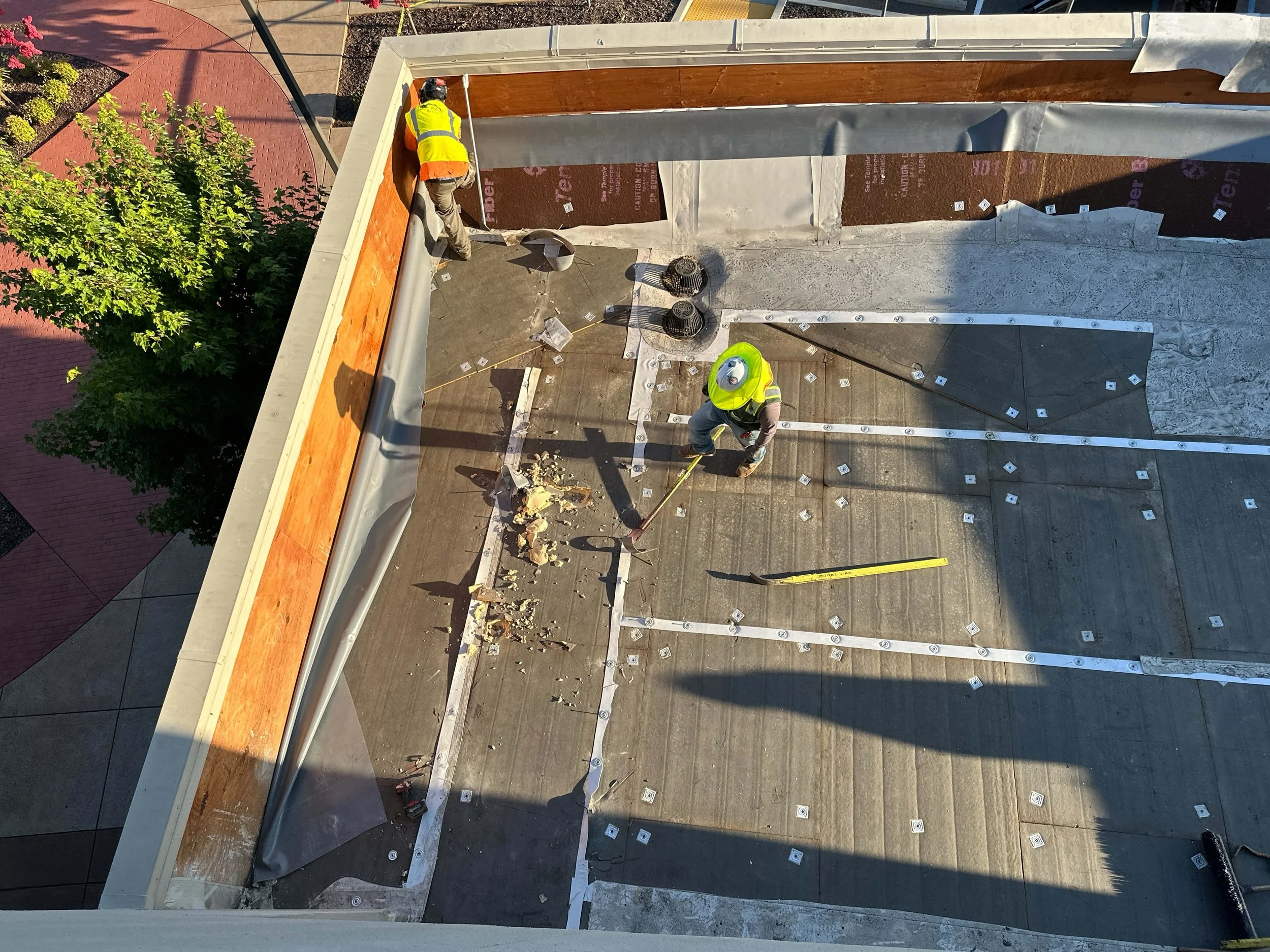 This project involves the demolition and replacement of the roofing system and deck on the second floor adjacent to the breakroom. Work includes installation of a new roof membrane, insulation, protection board, walkway pads, flashing at equipment and penetrations, drainage components, and replacement of roof access ladders and two skylights above the stairwell.