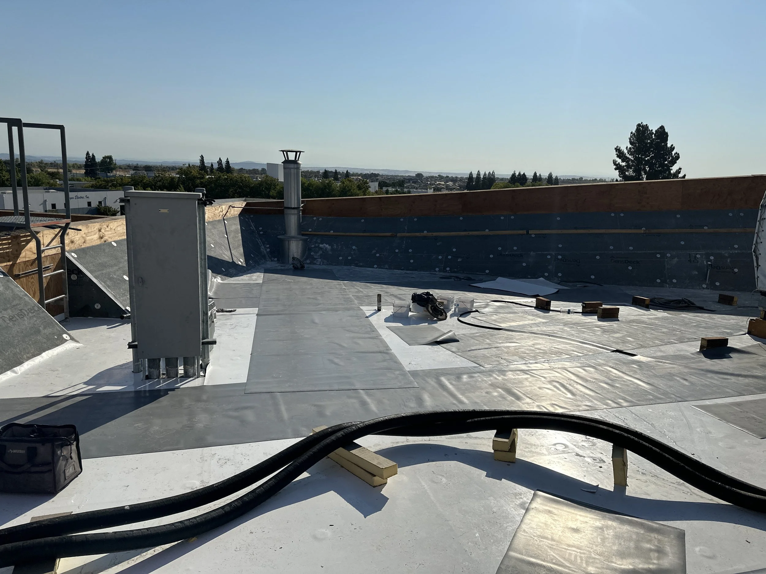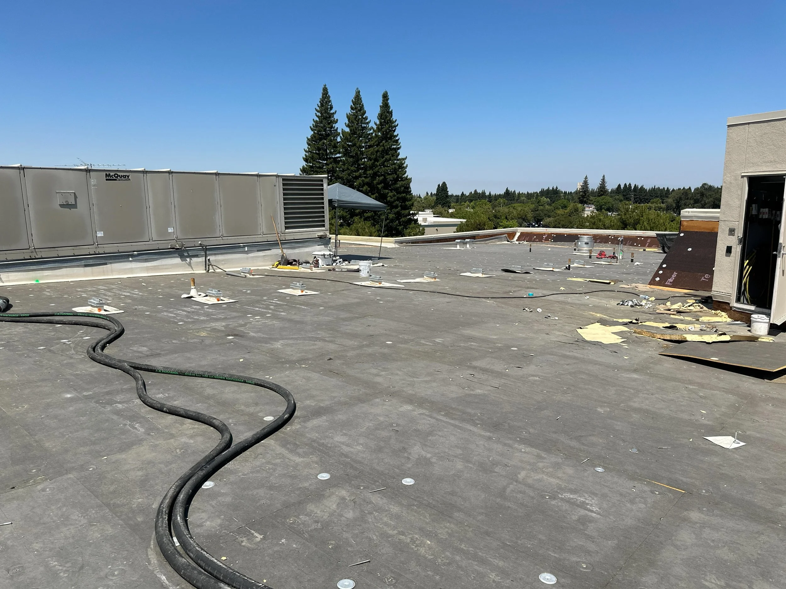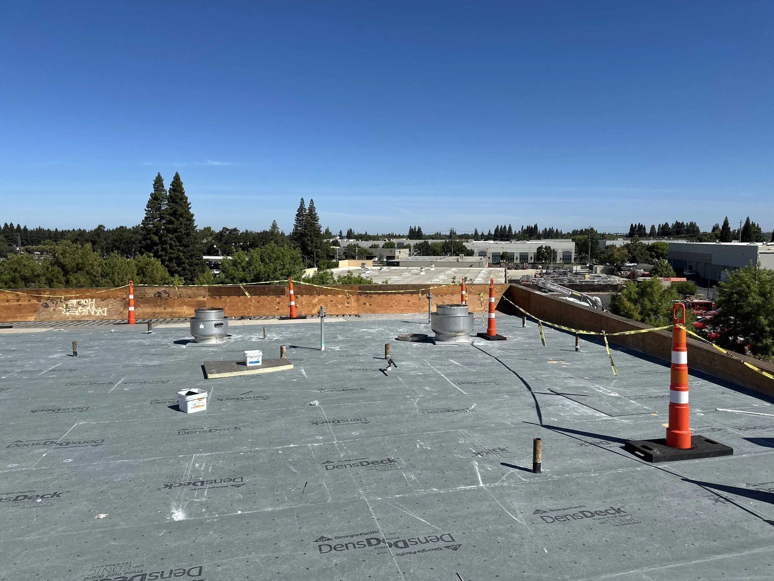 This project involves the demolition and replacement of the roofing system and deck on the second floor adjacent to the breakroom. Work includes installation of a new roof membrane, insulation, protection board, walkway pads, flashing at equipment and penetrations, drainage components, and replacement of roof access ladders and two skylights above the stairwell.