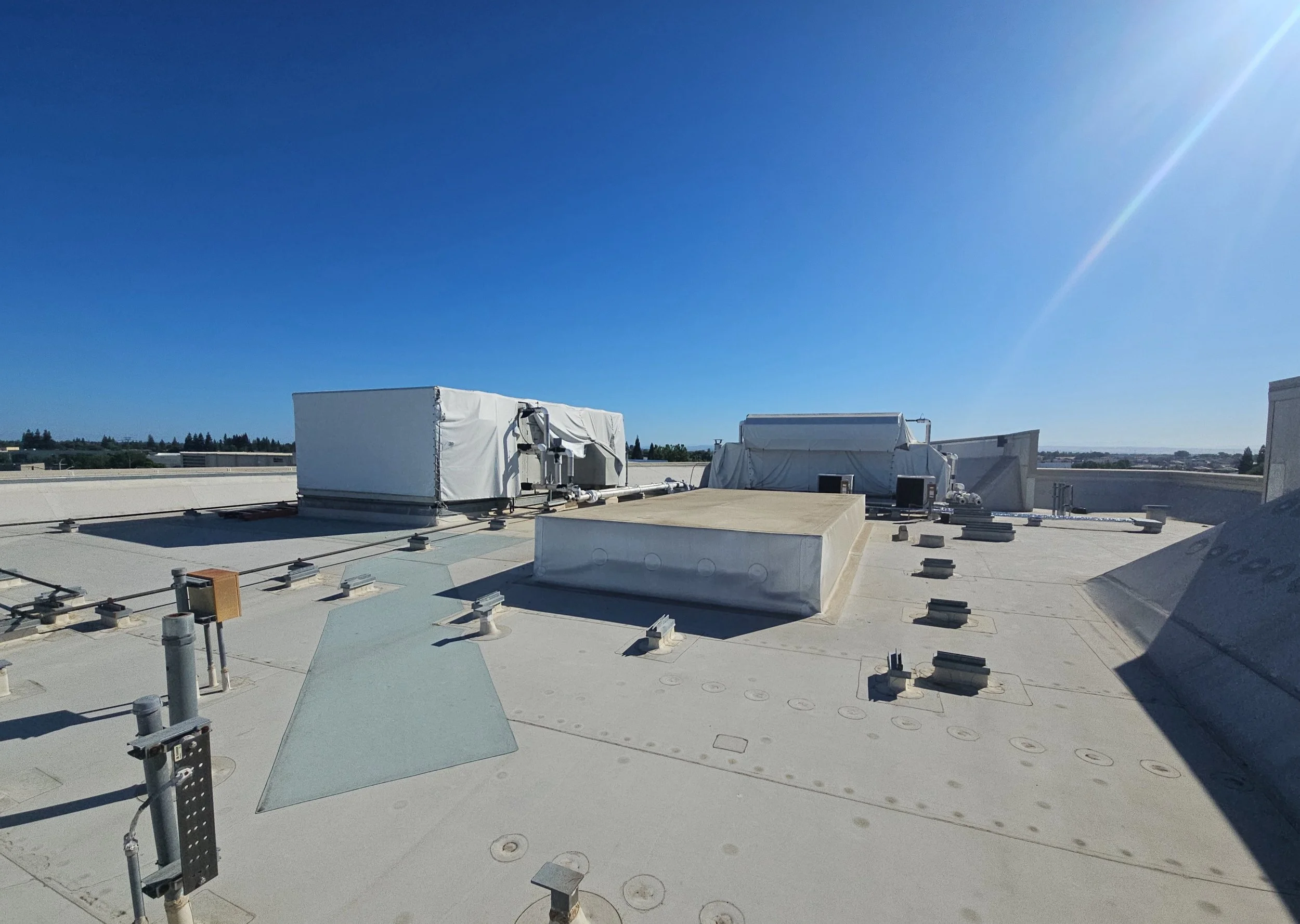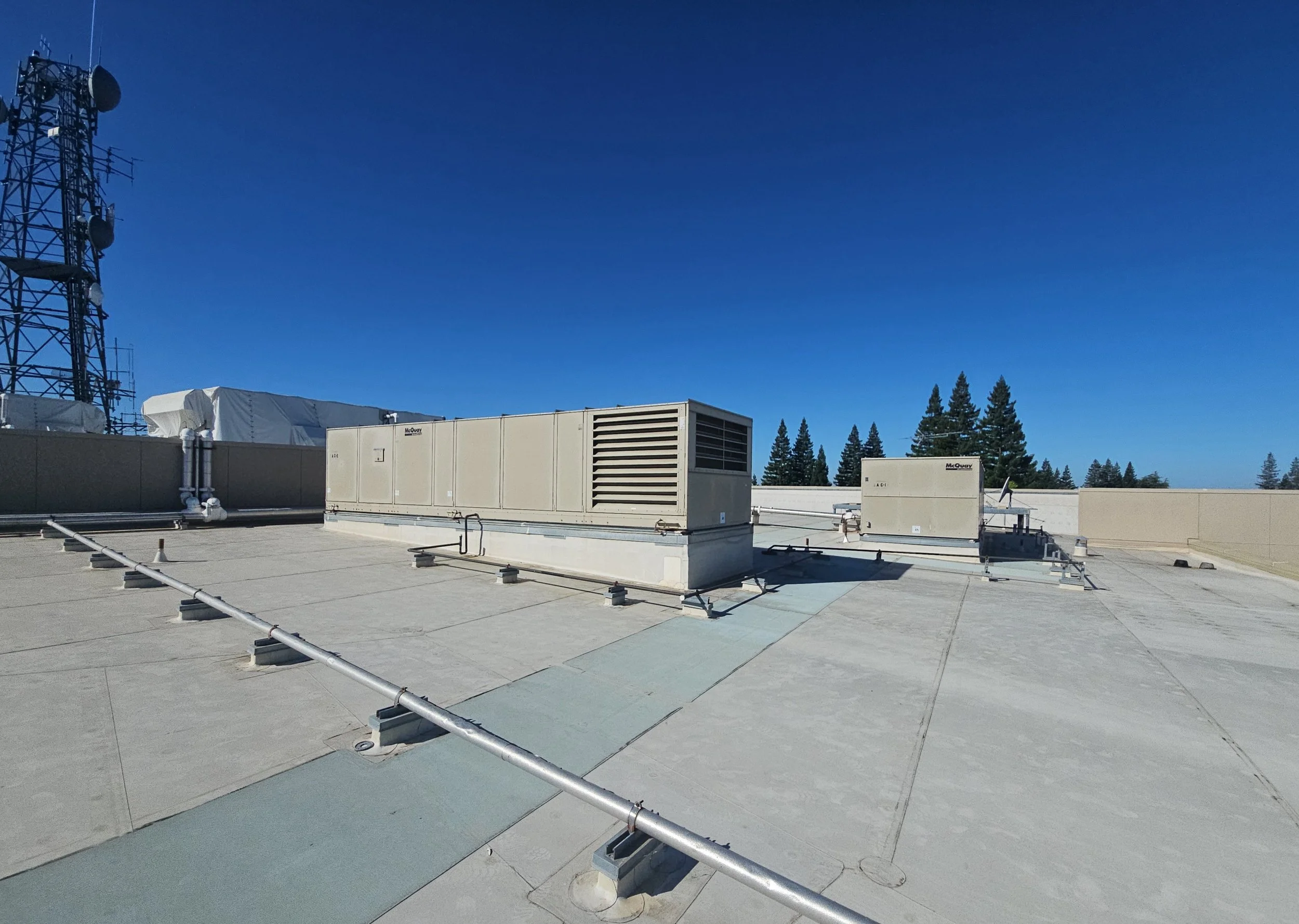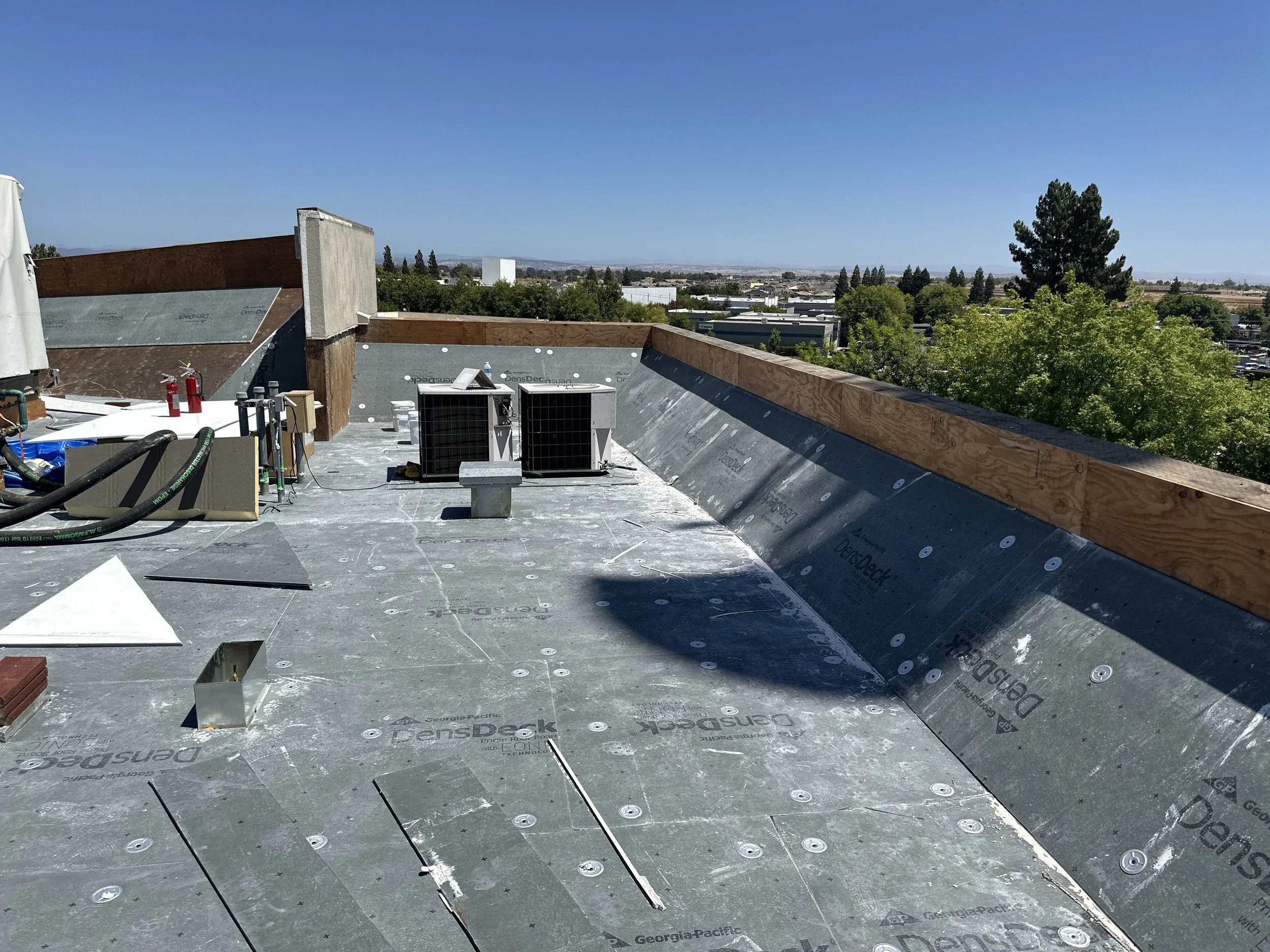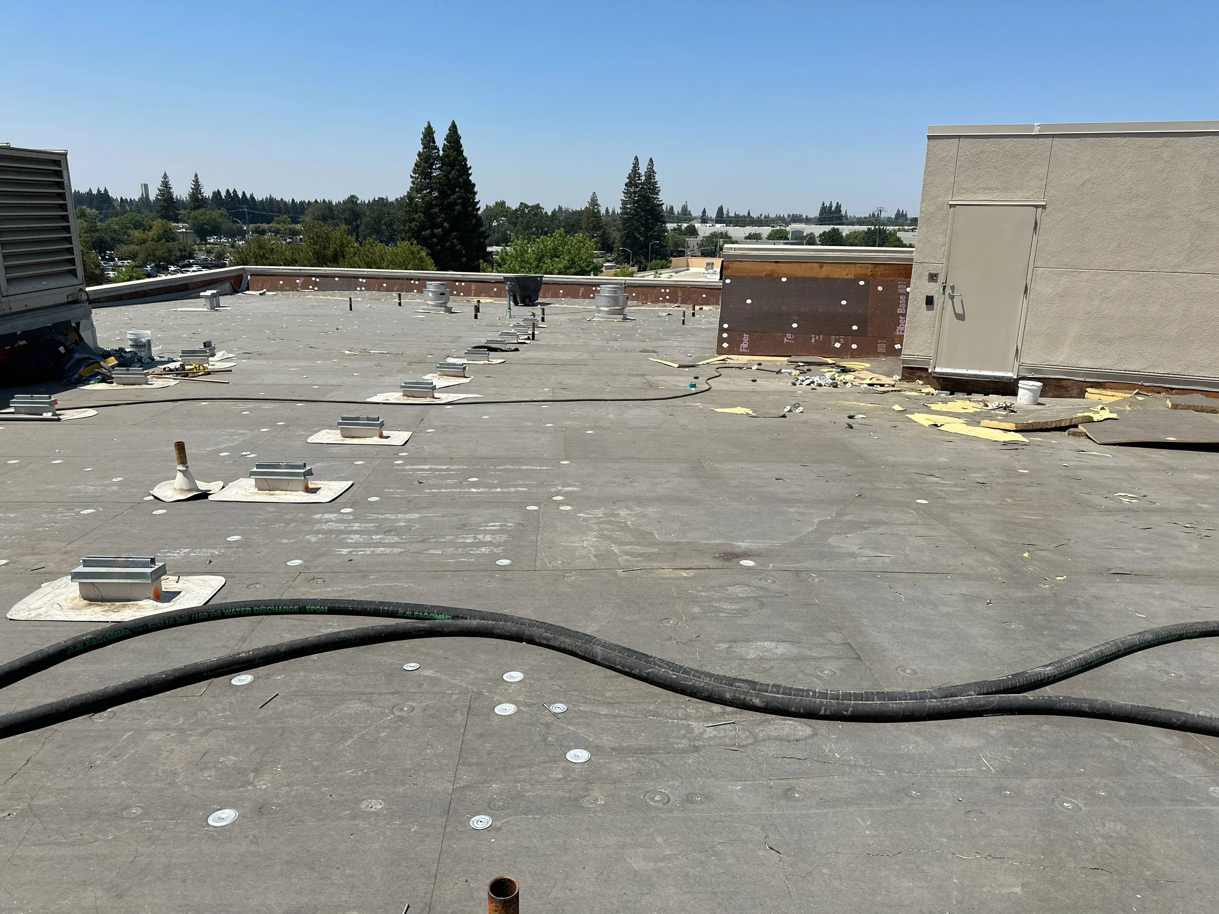 This project involves the demolition and replacement of the roofing system and deck on the second floor adjacent to the breakroom. Work includes installation of a new roof membrane, insulation, protection board, walkway pads, flashing at equipment and penetrations, drainage components, and replacement of roof access ladders and two skylights above the stairwell.