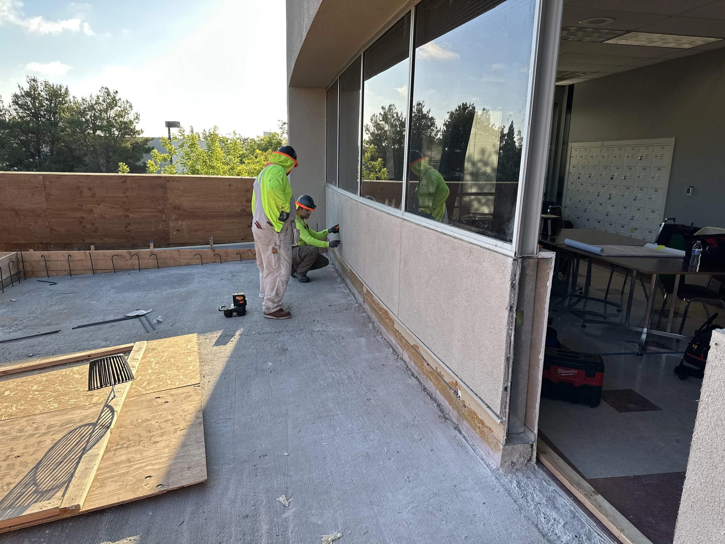 An accessible roof patio will be constructed with concrete curbing, pedestal pavers, guardrails, and modifications to the storefront system to incorporate a new door and window. Scope also includes hardware, lighting, and code-compliant accessibility upgrades to restrooms and the elevator.