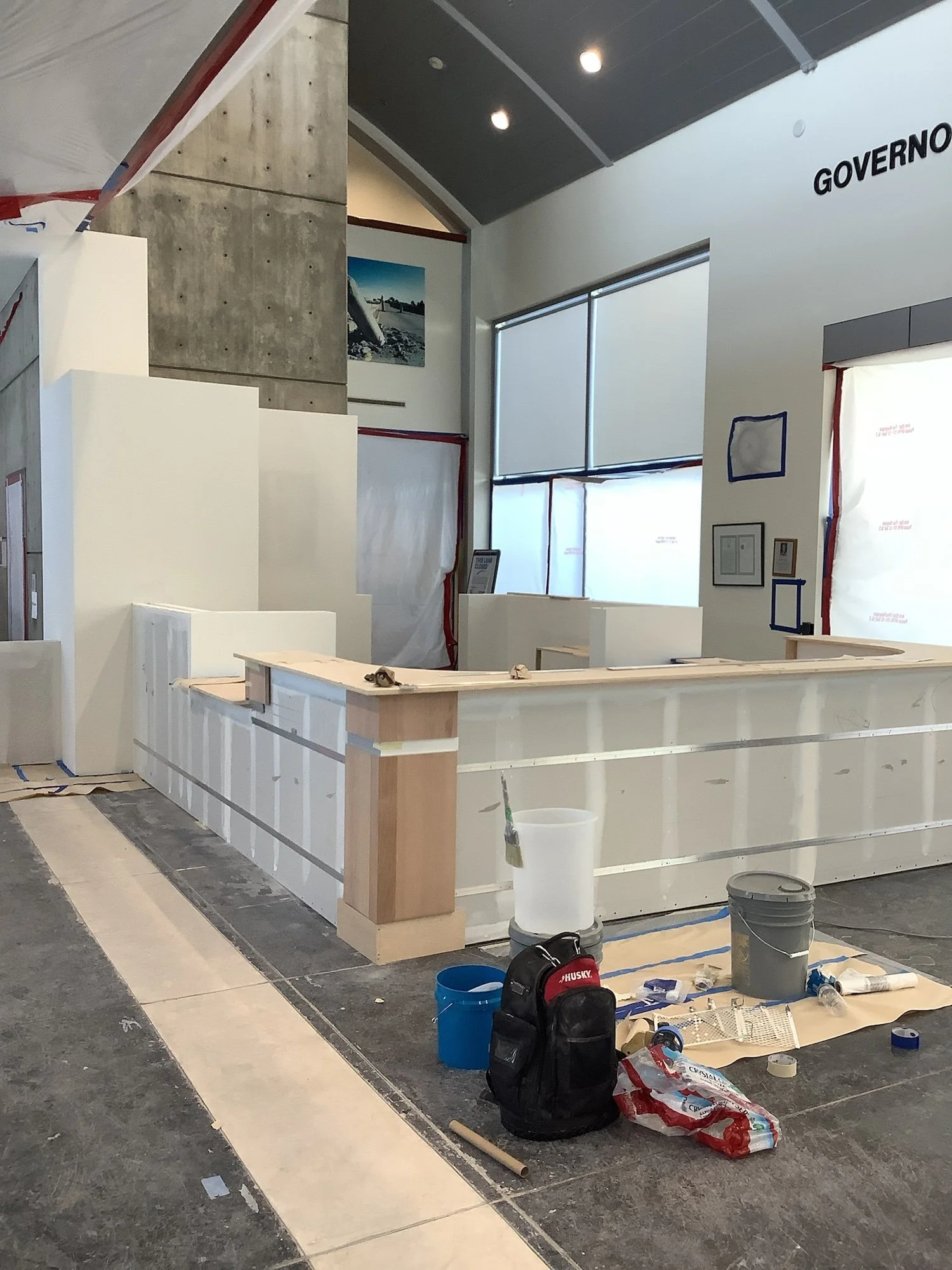 This project focuses on the renovation of the main entry lobby area on the ground floor. The scope of work includes the complete remodel of the security desk area to enhance functionality and security. Improvements consist of replacing the existing MSF reception counter with a new built-in workstation designed to accommodate three security officers, installing new built-in cabinetry and worksurfaces, integrating access-controlled turnstiles, and adding decorative lighting. The project also involves selective demolition and associated new electrical work to support the updated layout and systems.